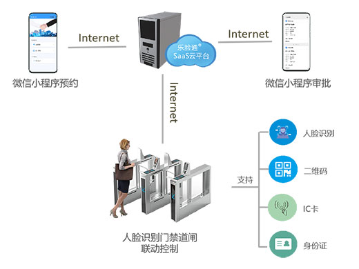 訪客來訪提前預約解決方案采用云端部署的方式、無需安裝訪客一體機,無需現場身份核驗,訪客只需在微信小程序上提前預約,填寫個人信息和人臉照片,由云服務器將訪客信息下發給對于的人臉識別設備,訪客到訪即可刷臉通行。